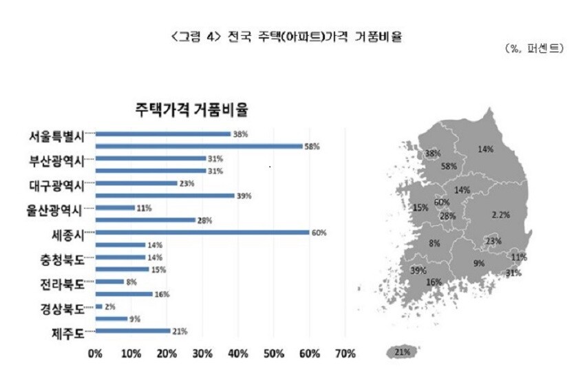 또한 한경연이 전국 200여개 아파트단지의 적정가격과 실제 거래가격을 비교한 결과, 서울은 현재 형성된 시세의 38% 이상, 경기는 58% 이상, 지방은 19% 이상 과대평가되어 가격에 거품이 과도하게 존재하는 것으로 분석되었다.