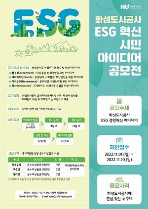 [이코노미세계] 화성도시공사(사장 김근영, 이하 HU공사)는 오는 11월 1일부터 20일까지 약 3주간 ‘ESG 혁신 아이디어 공모전’을 실시한다고 밝혔다.