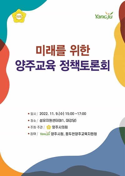 시의회가 주최·주관하는 이번 정책토론회는 ‘미래를 위한 양주교육’이라는 주제로 경기섬유종합지원센터에서 열린다.