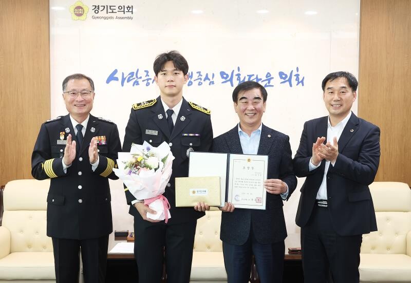 염 의장은 지난 14일 의장 접견실에서 윤종영 도의원(국민의힘, 연천), 이선영 연천소방서장이 배석한 가운데 연천 전곡119안전센터 소속 김신영 소방사(25)에 화재진압 유공자 표창을 수여했다.