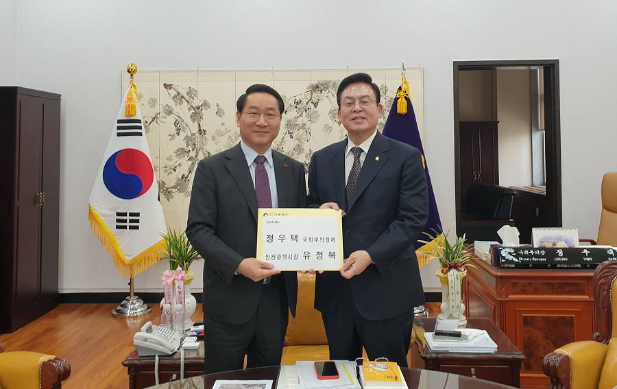 이날 유정복 시장은 국민의힘 소속 정우택 국회부의장을 만나 인천지역 현안 사업에 대한 지원과 국비 확보를 요청했다.