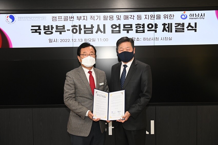 [이코노미세계] 하남시(시장 이현재)가 미군반환공여지인 캠프콜번 개발사업의 원활한 추진을 위해 국방부 주한미군기지이전사업단(단장 안영호)과 업무협약(MOU)을 체결해 캠프콜번 개발사업에 탄력을 받게 됐다.