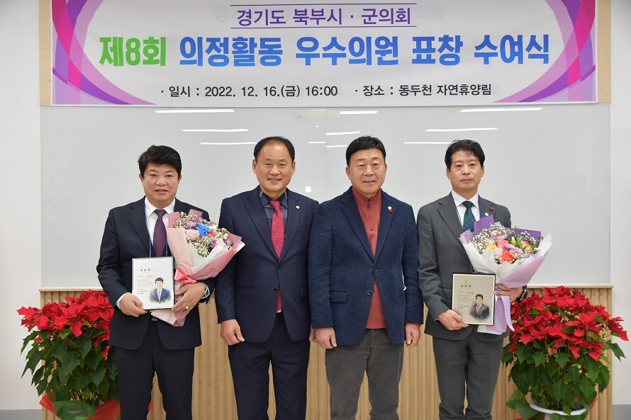 [이코노미세계] 동두천시의회 황주룡 부의장과 김재수 의원이 지난 16일 동두천시 자연휴양림에서 열린 "제8회 경기북부시군의회 의정발전 우수 의원" 시상식에서 우수 의원으로 선정됐다.