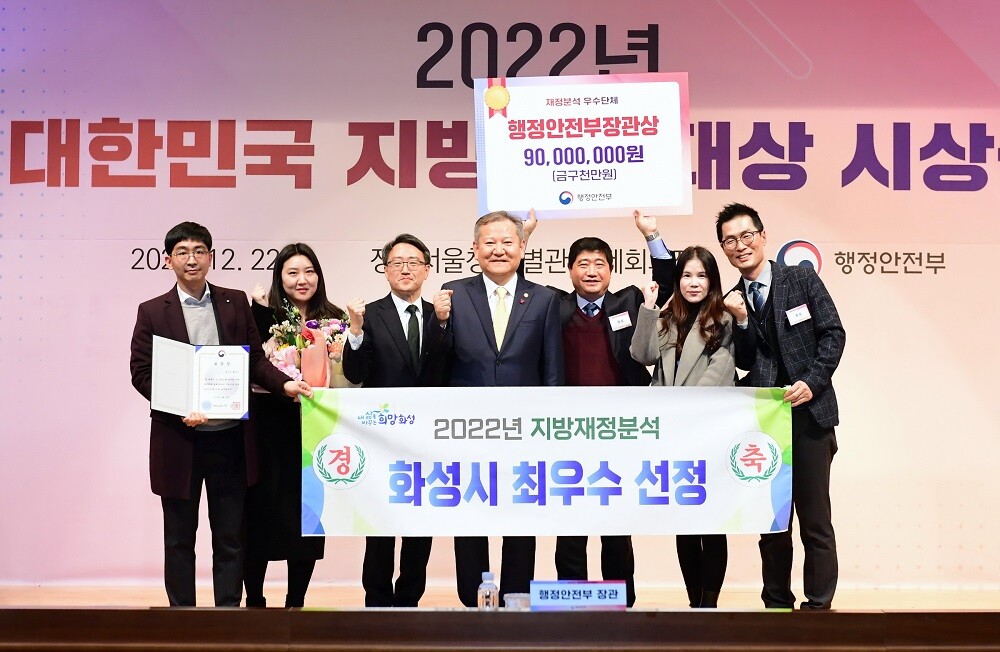 [이코노미세계] 화성시가 탄탄한 재정능력으로 22일 서울청사 별관에서 열린 ‘대한민국 지방재정대상’시상식에서 재정분석 부문 최우수상을 수상했다.