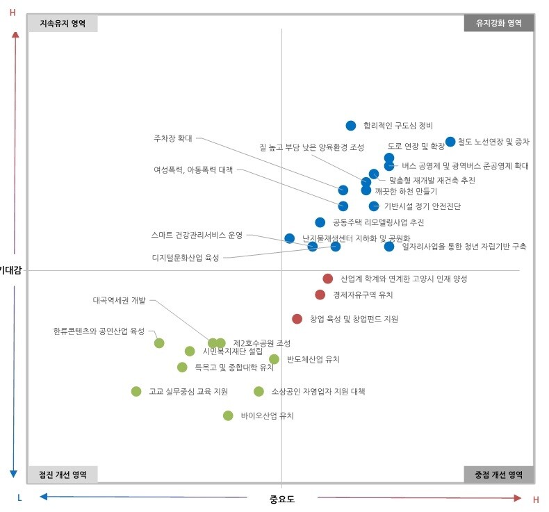 주요 정책사업에 대해 시민들이 보는 중요도와 기대감을 4사분면에 표시한 매트릭스 분석에 따르면 중요도와 기대감 모두 평균을 넘는 정책은 15개로 나타났다. 그 중 ▲철도 노선연장 및 증차 ▲도로 연장 및 확장 ▲합리적인 구도심 정비 ▲버스 공영제 및 광역버스 준공영제 확대 ▲맞춤형 재개발 재건축 추진 순으로 시민들의 기대감과 중요도가 높은 것으로 분석되었다.