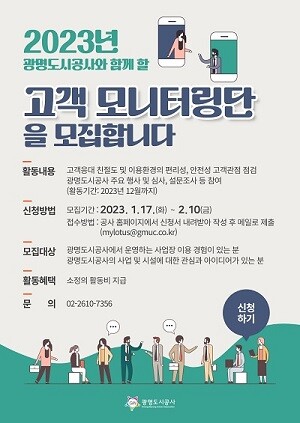 [이코노미세계] 광명도시공사(이하 공사)는 소통 및 참여를 통한 고객 중심 경영의 실현을 위해 17일부터 오는 2월 10일까지 ‘2023년 고객 모니터링단’을 모집한다고 밝혔다.