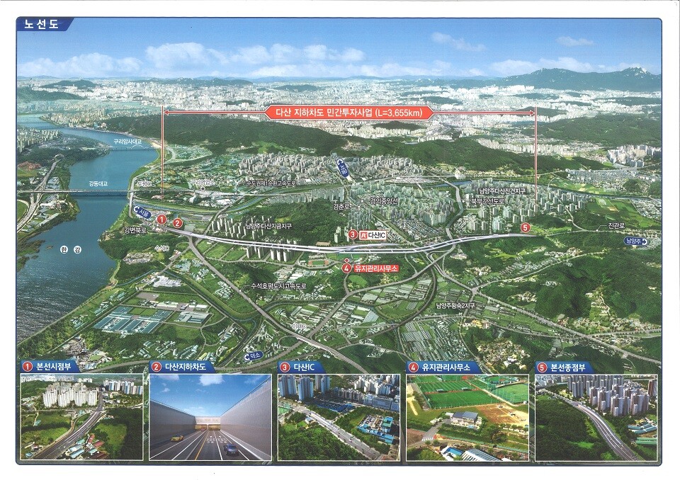 다산지하차도 민간투자사업은 지방도 383호선 다산동 일패근린공원 입구에서 다산지금로 수석동 가운사거리까지 연장 3.6km, 왕복 4차로의 대심도 터널을 구축하는 사업으로, 3기 신도시 입지 등으로 발생하는 교통 수요에 맞춰 신규 간선 교통망을 확충하기 위해 제안됐다.