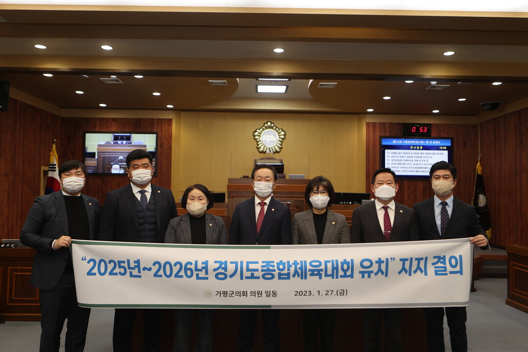 또한, 가평군의회에서는 「2025년 ~ 2026년 경기도종합체육대회 유치 지지 결의문」(대표발의: 김종성 의원)을 채택하여 2025년 ~ 2026년 경기도종합체육대회」유치에 군민의 대의기관인 가평군의회가 동참하여 성공적인 대회가 되도록 강력히 지원할 것임을 결의하였다.