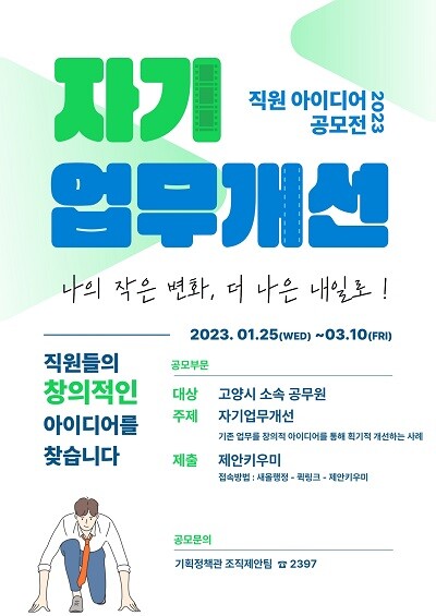 공모전은 고양시 직원 누구나 개인 또는 팀으로 참여할 수 있으며, 공모 접수는 1월 25일부터 3월 10일까지 고양시가 전국최초 자체개발한 제안제도 통합플랫폼 ‘제안키우미’를 통해 받는다.