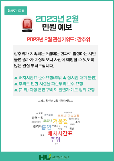 HU공사 고객지원센터는 월간 단위로 특정 시기에 주기적으로 발생하는 민원 사례뿐만 아니라 사회적 현안, 주요 정책 관련 주제 등 특정 민원 이슈 민원 예보도 발령할 계획이다.