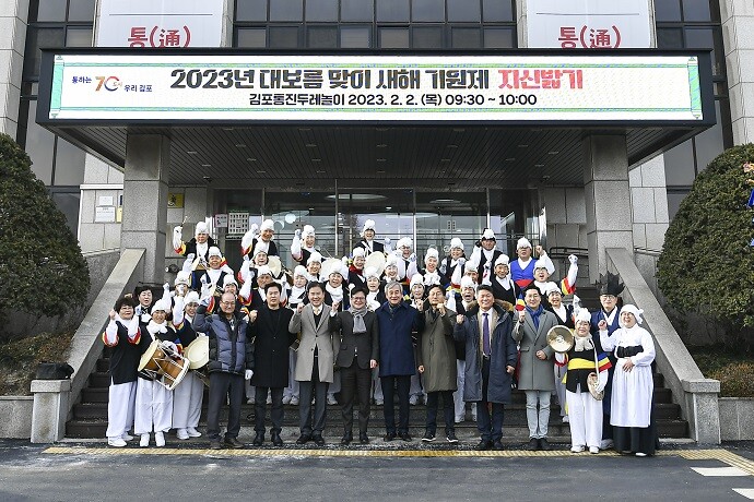 [이코노미세계] 김병수 김포시장은 2일 김포시청 본관 앞에서 ‘2023년 새해기원 지신밟기’ 행사를 진행했다. 이번 행사는 김포시 안녕을 기원하기 위해 김포통진두레놀이보존회(경기도무형문화재 제23호) 주관으로 열렸다.