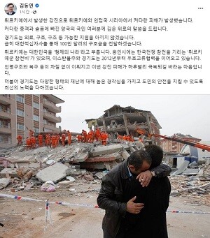 김동연 경기도지사는 7일 자신의 사회관계망서비스(SNS)에 “대한적십자사를 통해 100만 달러의 구호금을 전달하겠다”면서 “커다란 충격과 슬픔에 빠진 양국 국민 여러분께 깊은 위로의 말씀을 드린다. 의료, 구호, 구조 등 가능한 지원을 아끼지 않겠다”고 밝혔다.
