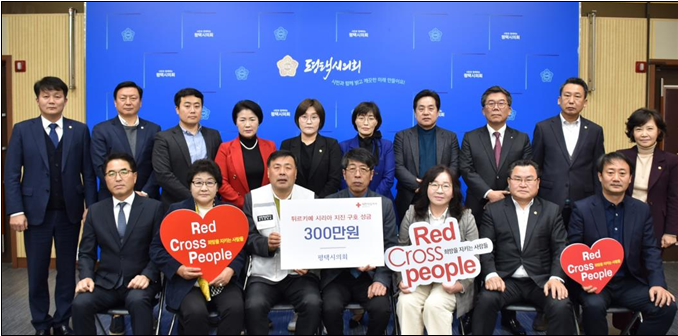 이번 성금은 의원 18명 모두와 사무국 직원들의 자발적인 참여로 마련됐으며, 대한적십자사 경기도지사를 거쳐 피난처, 식료품, 구호품 지원 등 현지의 피해 구호를 위해 사용될 예정이다.