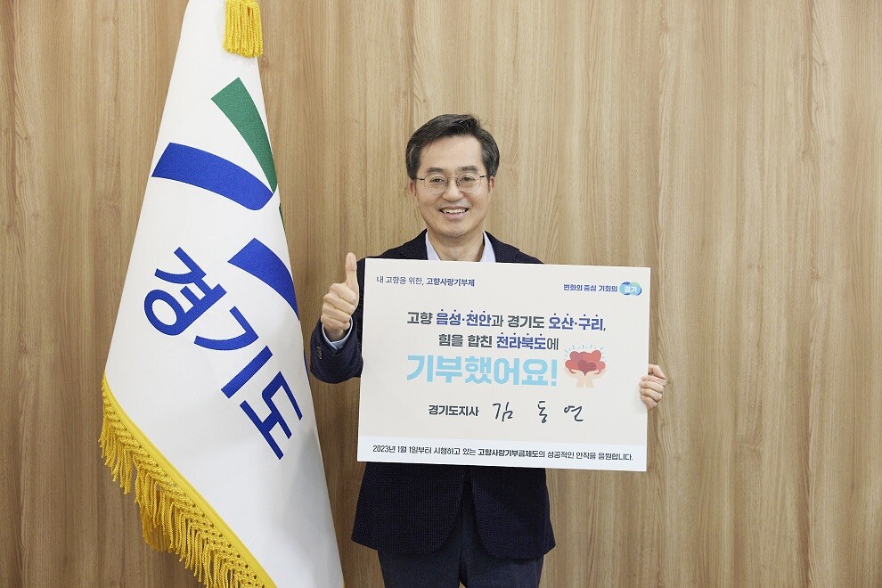 김 지사는 “김관영 전북도지사께서 ‘고향사랑기부 인증 챌린지’에 지목해 주셨습니다. 기쁜 마음으로 동참합니다”라고 동참 배경을 밝히면서 “저는 지난 1월 6일 경기도 남·북부의 오산과 구리, 제가 태어나고 자란 충북 음성, 아내를 대신해 충남 천안에 기부했고, 1월 17일 상생협력을 체결한 전라북도에도 기부했다”는 소식도 전했다.