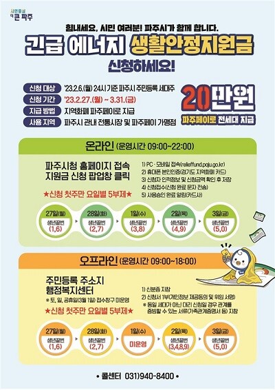 긴급 에너지 생활안정지원금은 2023년 2월 6일 24시 기준 파주시에 주민등록이 되어 있는 세대주가 신청할 수 있으며, 세대 당 20만 원을 지역화폐인 파주페이로 지급받는다.