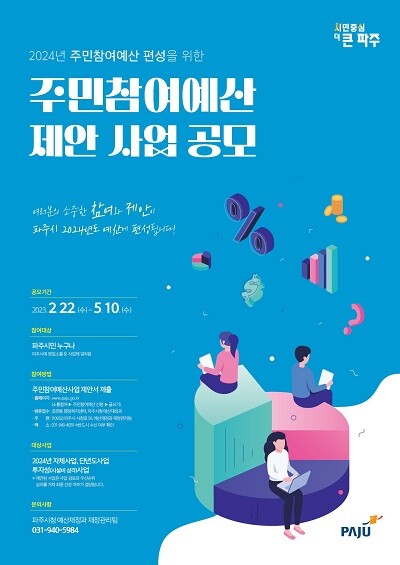 [이코노미세계] 파주시는 2월 22일부터 5월 10일까지 2024년도 예산 반영을 위한 주민참여예산 제안 사업 신청을 받는다.