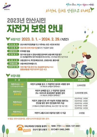 안산시에 따르면, 자전거 보험은 시에 주민등록을 둔 시민(외국인 포함)이면 별도의 가입절차 없이 자동으로 보험수혜자가 되며 개인 실손보험 가입 여부와 상관없이 보상받을 수 있다.