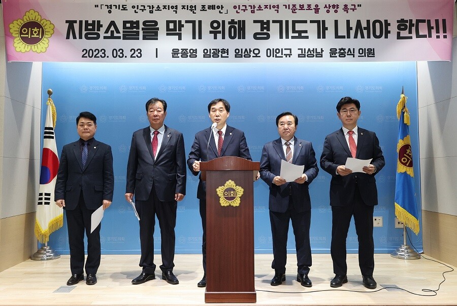 [이코노미세계] “지방소멸을 막기 위해 경기도가 나서야 한다" 경기도의회 윤종영(국민의힘, 연천), 임광현(국민의힘, 가평), 임상오(국민의힘, 동두천2), 이인규(더불어민주당, 동두천1), 김성남(국민의힘, 포천2), 윤충식(국민의힘, 포천1) 의원은 23일 경기도의회 브리핑룸에서 「경기도 인구감소지역 지원 조례안」의 인구감소지역 기준보조율 상향을 촉구하는 기자회견을 개최했다.