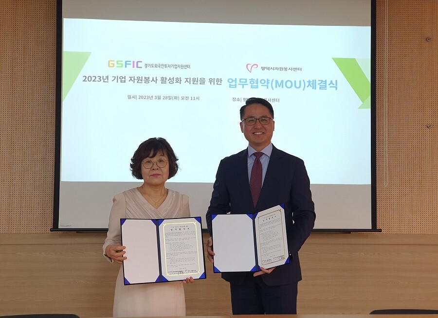 [이코노미세계] 평택시자원봉사센터(센터장 손영희)와 ‘경기도외국인투자기업지원센터(센터장 김용문)’는 지난 28일 평택시자원봉사센터 교육장에서 기업 자원봉사 활성화를 위한 업무협약을 체결했다.
