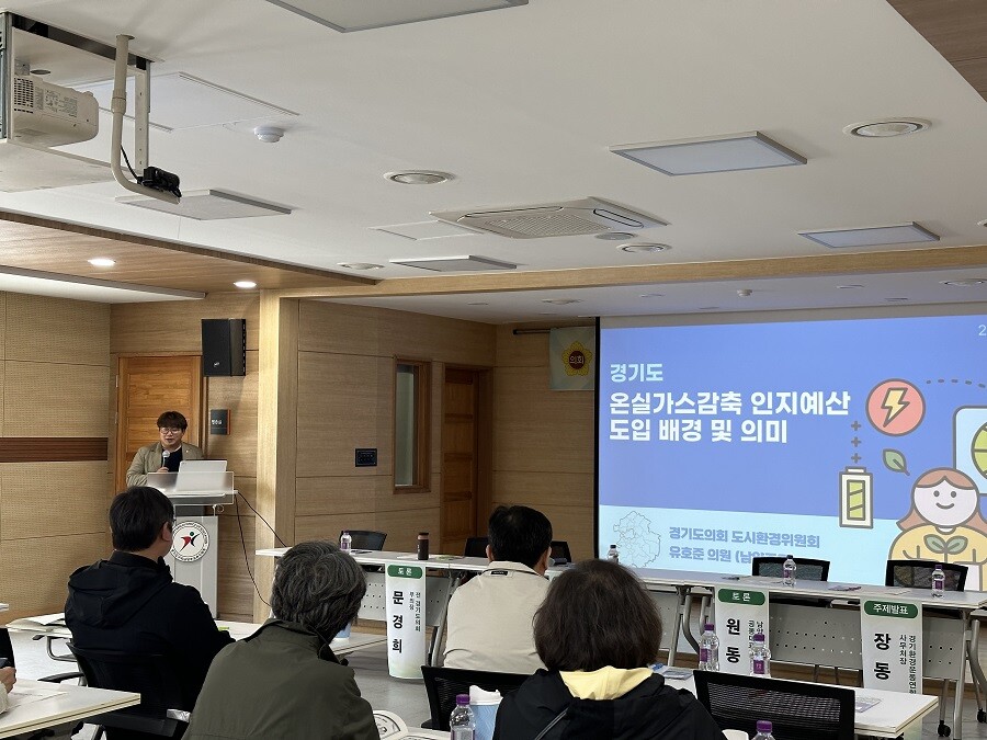 이 자리에서 유호준 의원은 경기도 온실가스감축인지 예산제 도입의 필요성을 소개하고 대표 발의한 ‘경기도 온실가스감축인지 예산 운영 조례’를 설명하는 시간을 가졌다.