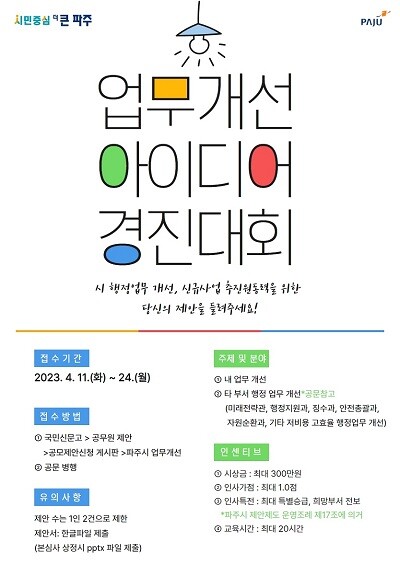 [이코노미세계] 파주시는 시 업무 전 분야에 대한 업무개선 아이디어 경진대회를 개최하기로 하고, 오는 24일까지 아이디어를 신청받는다.