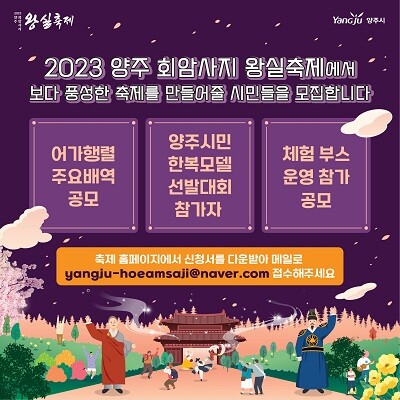 [이코노미세계] 양주시(시장 강수현) 오는 5월 5일부터 7일까지 양주 회암사지(사적) 일원에서 개최하는 ‘2023 양주 회암사지 왕실축제’부대행사에 참여할 시민 배역과 모델 등을 공모한다.