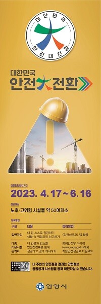 최대호 안양시장은 “대한민국 안전대전환을 위한 집중 안전점검으로 시민이 안심하고 생활할 수 있도록 철저히 점검해 안전한 안양을 만들어 가겠다”고 당부했다.