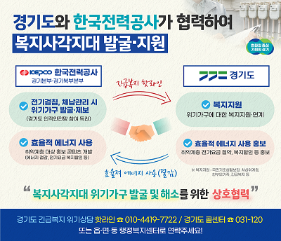 복지 사각지대 발굴 연계 외에도 한국전력공사 경기본부‧경기북부본부는 경기도와 함께 경제적 어려움을 겪는 취약계층을 대상으로 효율적인 에너지 사용과 전기요금 복지 할인제도 신청을 통한 전기요금 부담 완화 등의 내용을 적극 홍보한다.