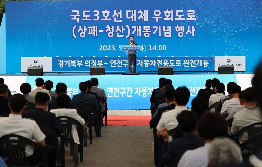 서울지방국토관리청은 30일 동안터널 일원에서 국도3호선 대체우회도로(상패~청산 구간) 개통식을 개최했다. 이날 개통식에는 김덕현 연천군수, 김성원 국회의원, 오후석 경기도 행정2부지사, 안경호 서울지방국토관리청장, 박형덕 동두천시장 등 100여 명이 참석했다.
