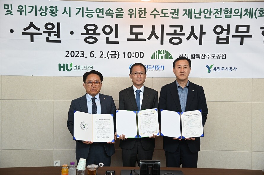 [이코노미세계] 화성도시공사(사장 김근영)는 화성 함백산추모공원에서 전국 최초로 수원도시공사(사장 허정문), 용인도시공사(사장 최찬용)와 함께 ‘수도권 재난안전협의체’ 본 협약을 체결했다고 5일 밝혔다.