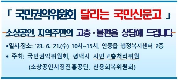 이번 ‘달리는 국민신문고’는 소상공인시장진흥공단과 신용회복위원회, 평택시 시민고충처리위원이 협업으로 참여하며,