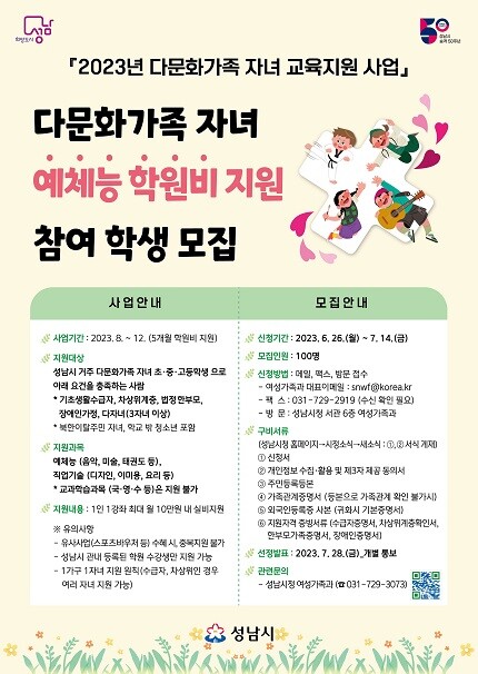 [이코노미세계] 성남시는 다문화가족 자녀에 오는 8월부터 연말까지 5개월간 월 최대 10만원의 예체능 학원비를 지원한다고 26일 밝혔다.