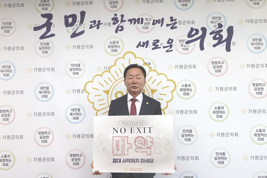 [이코노미세계] 가평군의회 최정용 의장이 29일 오전 의장실에서 마약범죄 예방 릴레이 캠페인 《노 엑시트(NO EXIT)》에 동참했다.