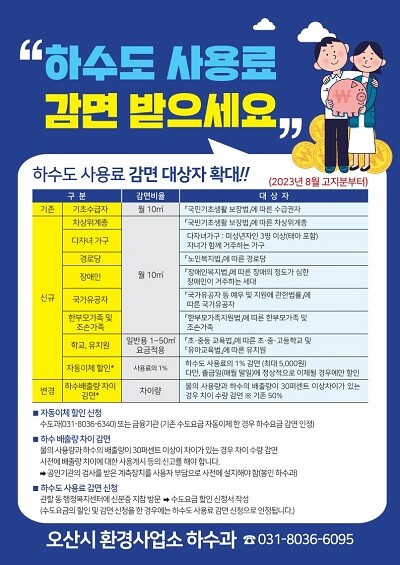▲기초 수급자 및 차상위 계층 ▲태아를 포함한 미성년자 3명 이상의 자녀를 둔 다자녀가정 ▲장애의 정도가 심한 장애인 거주 세대 ▲국가유공자 ▲미성년 자녀를 둔 한부모 가족 및 조손 가정 등은 매월 하수도사용량 10톤을 할인받는다.