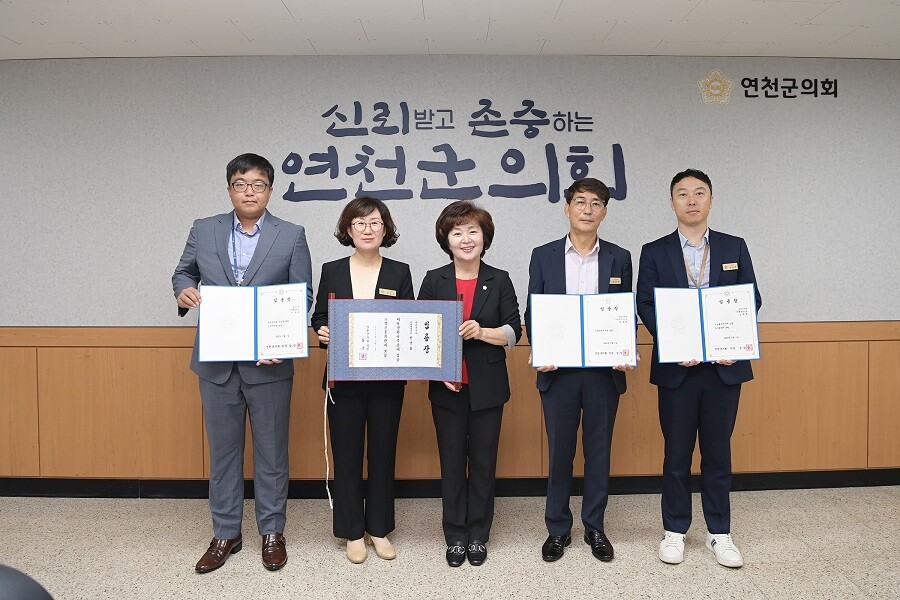 [이코노미세계] 연천군의회(의장 심상금)가 30일 연천군의회 의장실에서 인사발령자에 대한 임용장을 수여했다. 이번 수여식에서 지방행정사무관으로 승진 의결된 변영림 의사팀장을 수석전문위원으로, 임학현 주무관을 의사팀장으로, 원용천 주무관을 지방운전주사로, 이오근 주무관을 전문위원으로 임용하였다.