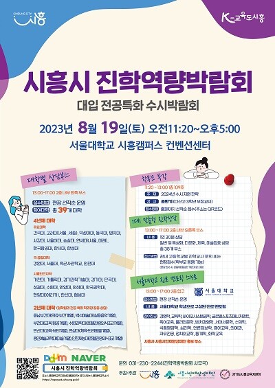 시흥시 고등학생과 학부모를 대상으로 열리는 진학역량 박람회에는 ▲서울대, 연세대, 고려대 등을 포함해 전공 특화계열(의료보건ㆍ교육ㆍ호텔관광외식조리ㆍ항공관광ㆍ예체능 등) 39개 대학의 40개 입학사정관 상담 부스와 ▲38개 진학상담 부스(일반, 예체능, 특성화, 다문화) ▲11개 서울대 진로 멘토링 스누로(경영학, 바이오시스템공학, 화학교육 등) ▲홍보 부스 등 총 5개의 부스가 준비된다. 아울러, 이날 2024년도 수시 지원 전략을 주제로 하는 학부모 특강이 진행된다.