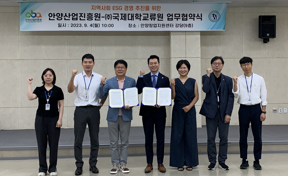 [이코노미세계] 안양산업진흥원(이사장 최대호)은 지난 4일 창업지원센터 9층 강당에서 ㈜국제대학교류원과 지역사회 ESG(환경·사회·지배구조) 경영 추진을 위한 업무협약을 체결했다고 6일 밝혔다.