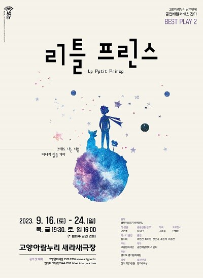 [이코노미세계] 고양문화재단은 오는 9월 16일 부터 24일 까지 고양아람누리 새라새극장에서 상주단체 공연배달서비스 간다의 연극 <리틀 프린스>를 선보인다. 새로운 레퍼토리 공연으로 자리매김한 <템플>에 이어 안무가 심새인과 연출가 민준호가 다시 한번 창작 콤비로 나서는 이번 작품은 생텍쥐페리의 세계적인 소설 『어린왕자』를 극화하여 지난 2022년 6월 초연하였고, 뛰어난 완성도로 재공연을 결정하여 올해 ‘BEST PLAY’ 시리즈의 두 번째 작품으로 고양 관객들을 만난다.