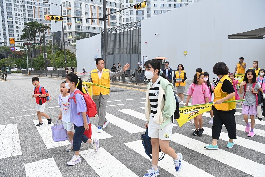 이현재 시장은 사업 시행 첫날인 11일 감일 더샵포웰시티에서 감일초등학교를 가는 320m 거리의 통학로를 방문, 아이들의 손을 잡고 함께 횡단보도를 건너는 등 안전한 등굣길을 책임지는 일일 워킹스쿨버스 도우미로 활약했다.