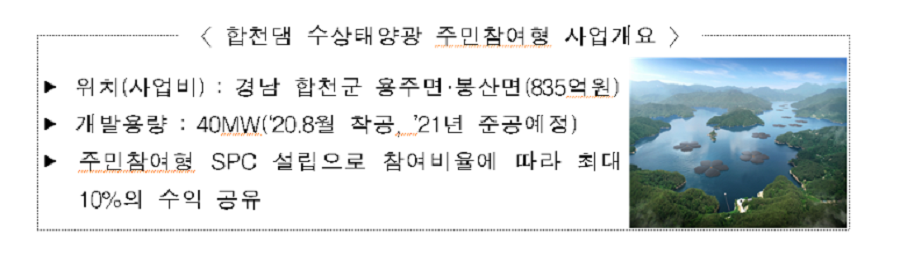 지난해 8월에 착공하여 올해 12월 준공예정인 합천댐 수상태양광 사업(40MW, 835억 원)은 지역주민이 투자에 참여하여 향후 20년간 투자금 대비 최대 4∼10%의 고정수익을 받을 수 있도록 설계되어 지역주민의 수용성을 높인 대표적인 모범사례로 평가를 받는다.