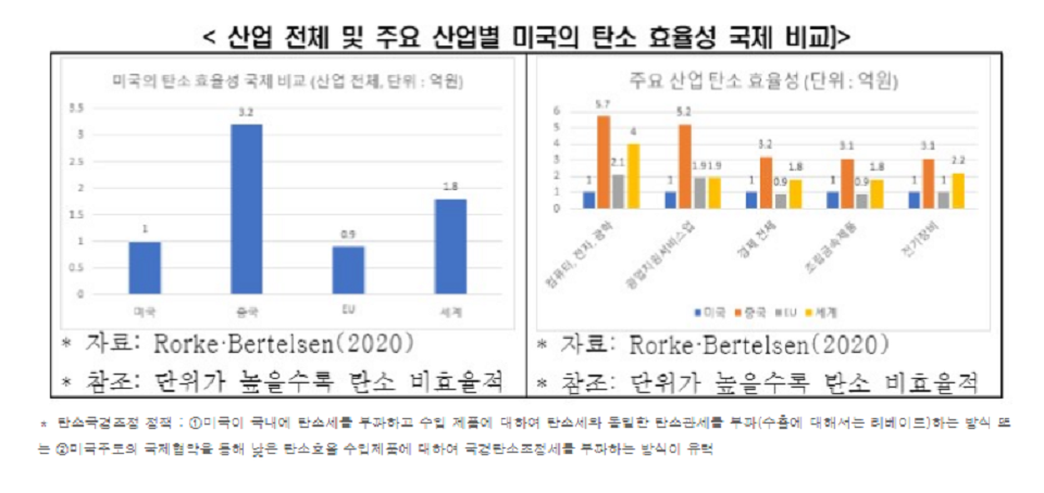 또한 미국의 기후변화대응정책에 따라 탄소국경조정 등 탄소집약적 재화에 대한 수입규제가 강화된다면, 우리 기업들의 대미 수출이 감소할 가능성이 높다고 보고서는 분석했다. 특히 온실가스 배출비중이 높은 1차금속, 화학, 정유 등의 산업들은 대미 수출에 치명적인 영향을 받을 가능성이 높다고 알려졌다.