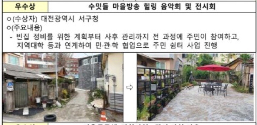 최우수상을 수상한 경북 김천시는 6.25 이후 형성된 역사 깊은 마을에 방치된 단층 목조주택의 역사·문화적 가치에 주목하였다. 빈집의 원형을 최대한 보존한 리모델링, 증축을 통해 커뮤니티 시설, 마을 기업의 지역특산품 판매시설 등으로 운영 중이다.