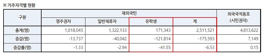 전체 재외동포 중 재외국민은 2,511,521명, 외국국적동포는 4,813,622명으로, 코로나19 및 경기침체 등으로 재외국민 수가 직전 통계 대비6.53%(175,593명) 감소한 것으로 나타났다. 특히 유학생 수가 293,157명에서 171,343명으로 41.55%(121,814명) 감소했다.