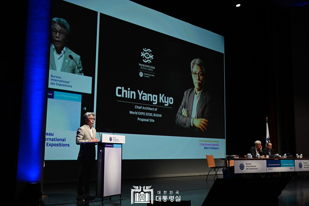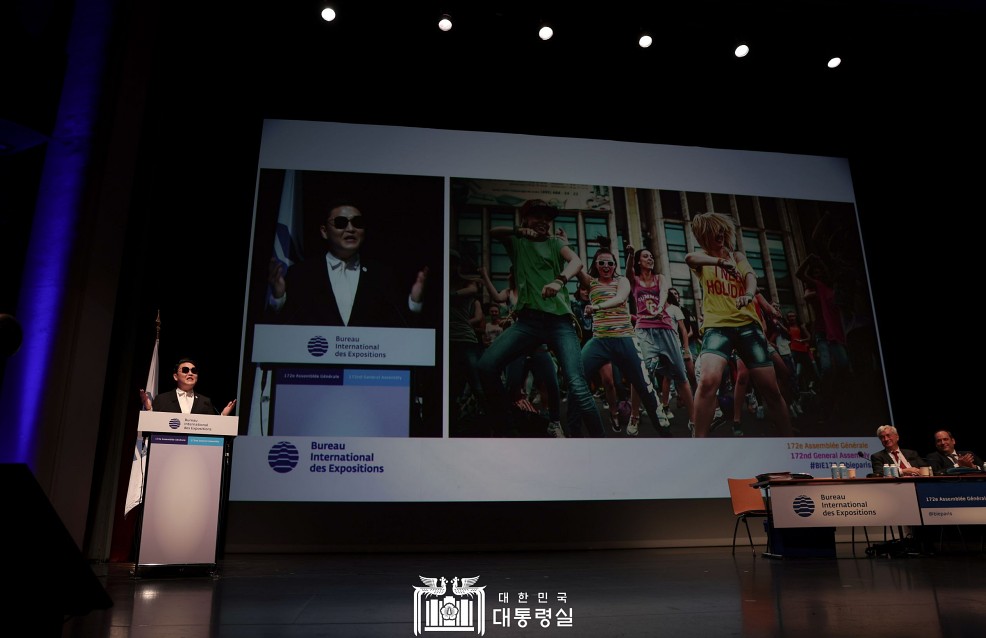 국제박람회기구 총회 계기 2030 부산 세계박람회 경쟁 프레젠테이션 첫 번째 연사로 무대에 등단한 가수 ‘싸이’는 ‘2030 부산 세계박람회, 세계가 하나 될 또 하나의 K-브랜드’를 주제로 K-POP 등 K-콘텐츠 성공의 바탕이 된 창조적이고 개방적인 대한민국의 장점을 강조했다.