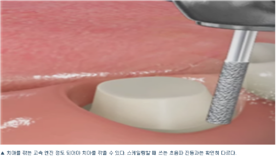 치아를 깎는 고속 엔진 정도 되어야 치아를 깎을 수 있다. 스케일링할 때 쓰는 초음파 진동과는 확연히 다르다. 스케일링은 한 번 하면 평생 해야 되는 것이 아니라 계속 하지 않으면 평생 후회할 것이라는 표현이 더 적절한 표현이다.