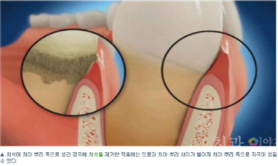 치석이 제거되면 치석이 제거된 공간만큼 잇몸이 벌어지고 그 공간을 통해 치아의 뿌리 쪽으로 자극이 가서 시릴 수 있다. 하지만 심하지 않은 경우 서서히 회복되면서 잇몸은 오히려 더 건강해진다. 물론 치석이 너무 심한 경우에는 치아 뿌리로의 자극이 매우 심하기 때문에 시린 증상이 좀 더 오래 갈 수 있다.